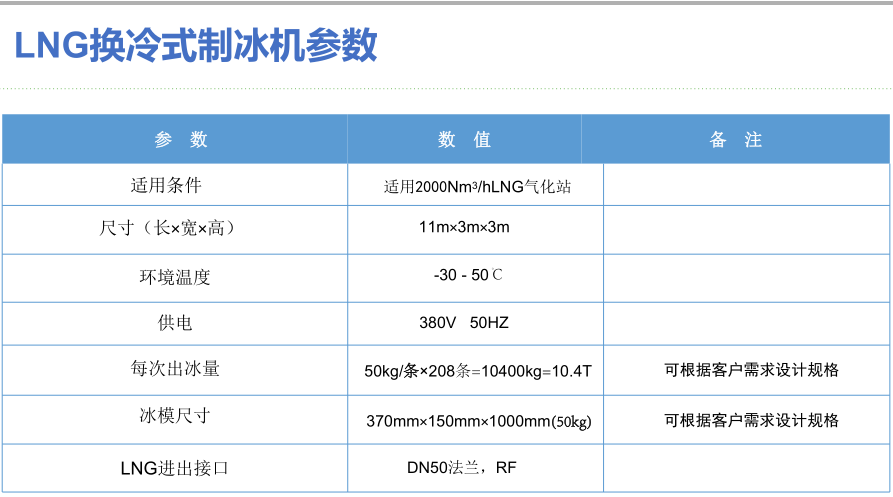 我公司最新研發(fā)生產(chǎn)的新型的LNG換冷式制冰機,可以將LNG中的冷能進行有效利用--制成冰塊,冰塊用于生產(chǎn)和日常生活中,變廢為寶,可獲得可觀的經(jīng)濟效益。